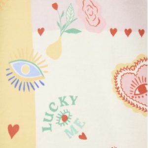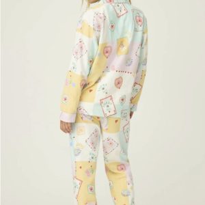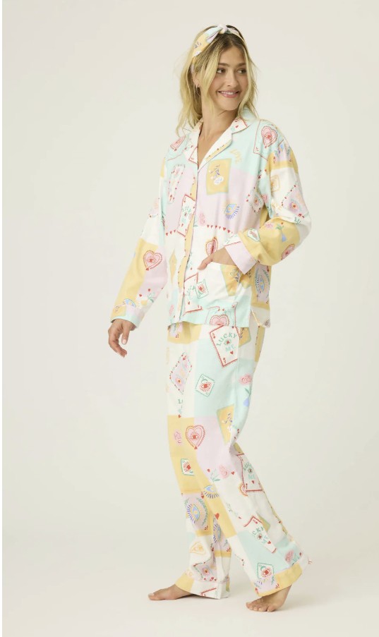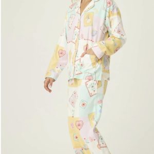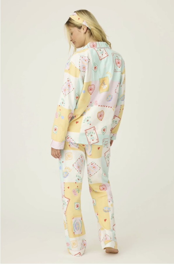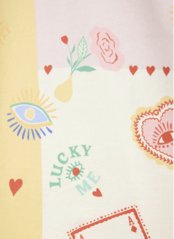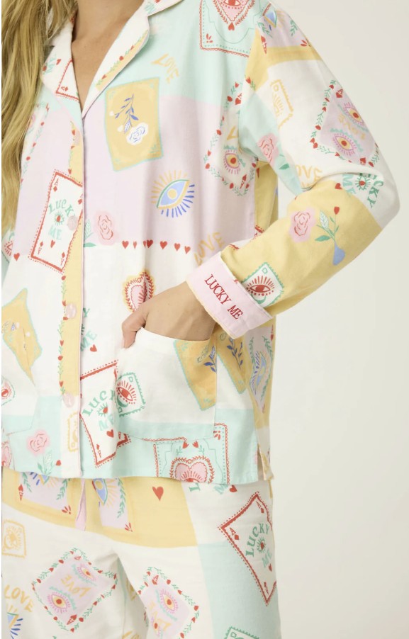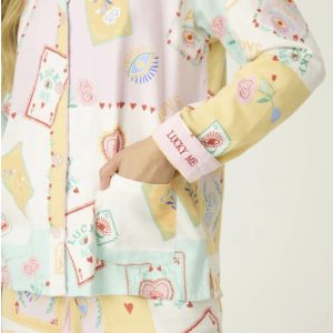 Set includes a button-up shirt, relaxed-fit pants, and a matching headband. The patchwork-style design blends soft ivory, pastel mint, peach, and lilac, scattered with playful motifs like lucky playing cards, eye talismans, radiant hearts, blooming flowers, and “Lucky Me” script for a look that’s as charming as it is cozy.