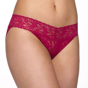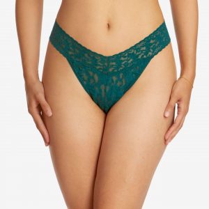 The Hanky Panky Original rise “one size” stretch lace thong sits high on the hip, above the hip bones and fits sized 4-14.