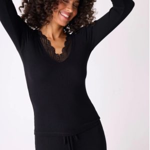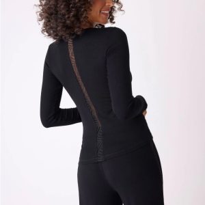 Elevate your lounge look with P. J. Salvage’s fitted black long sleeve top. The micro-rib modal knit fabric offers a soft, cozy feel, while the lace inset neckline and back detail add a touch of sophistication.