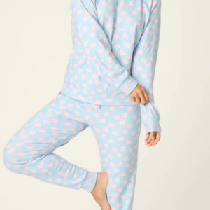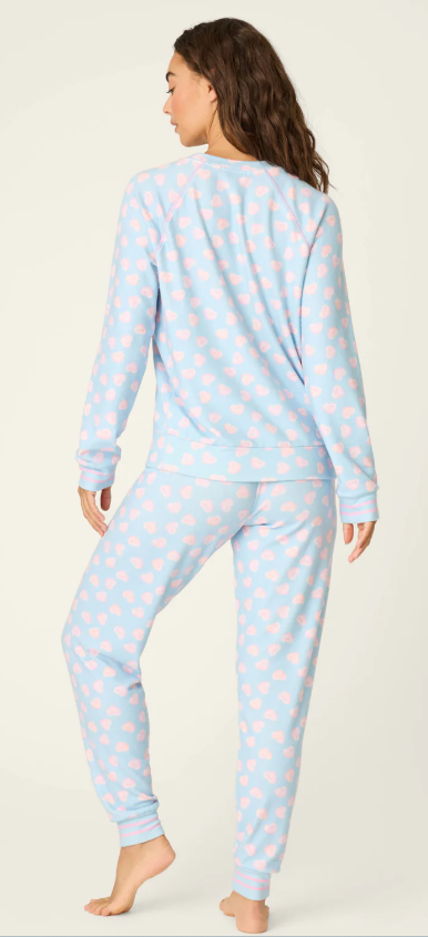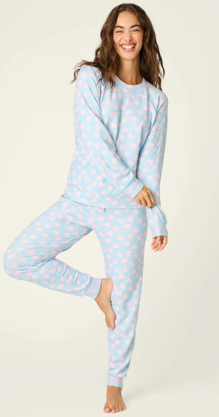 Crafted from our signature peachy jersey, the long-sleeve crewneck top and cuffed jogger style set is sprinkled with pastel hearts that read “Love,” adding a playful dose of sweetness .