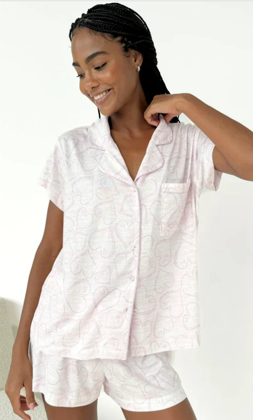 Made from brushed for softness Pillowsoft fabric, set includes a short sleeve notch collar button down and a contrast drawstring waist short. This set has a slight sheen, minimal texture and an extra cozy feel.